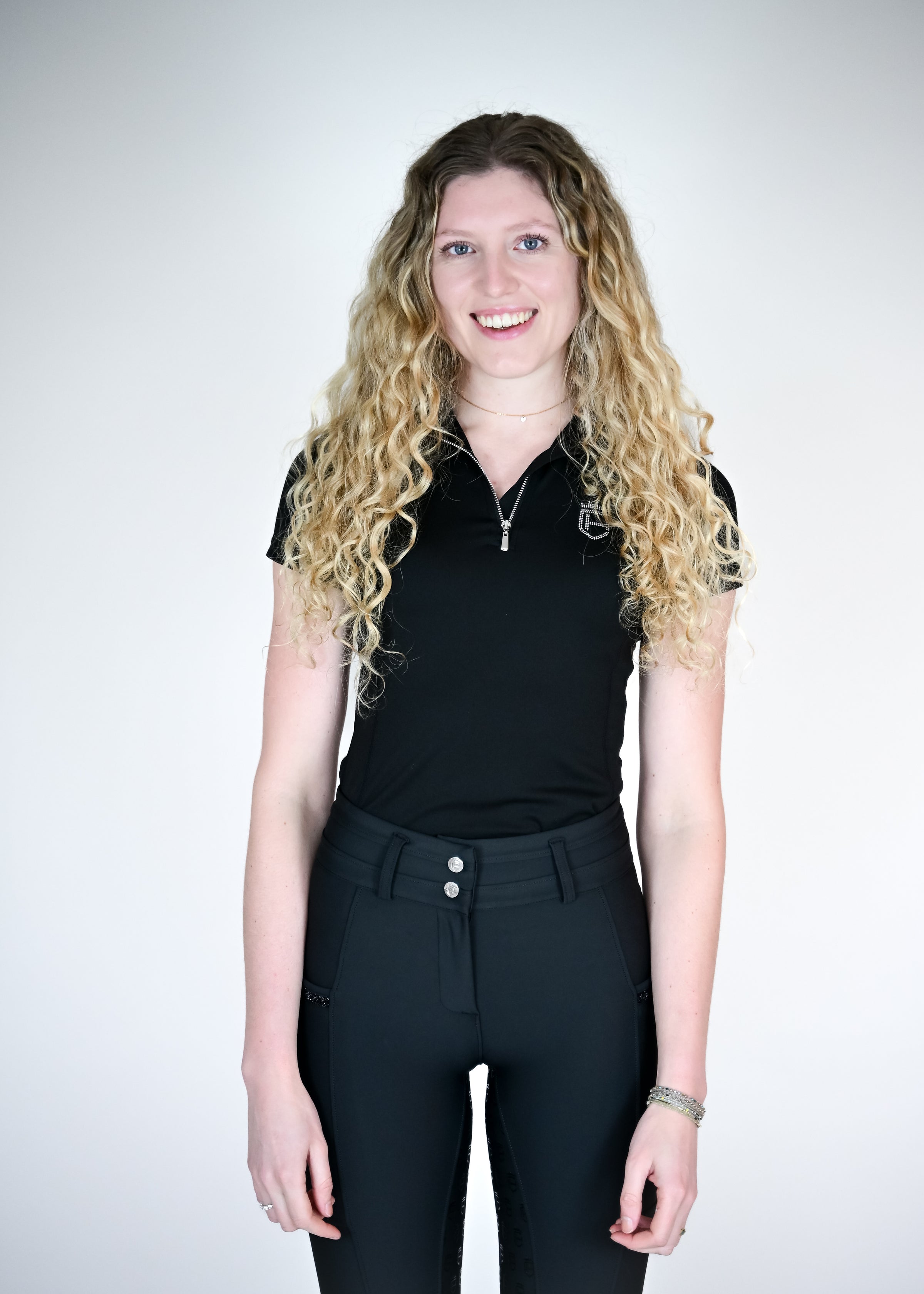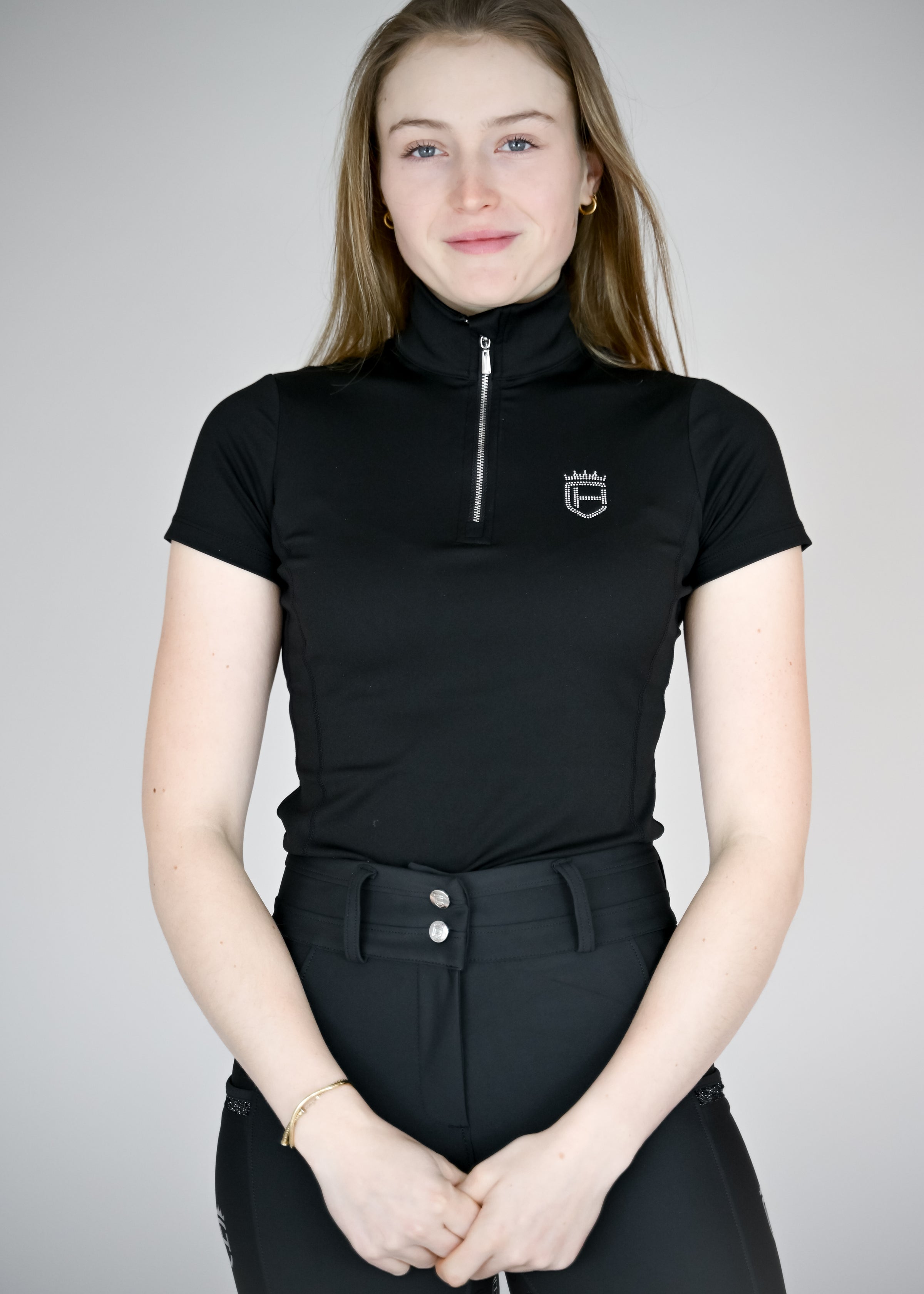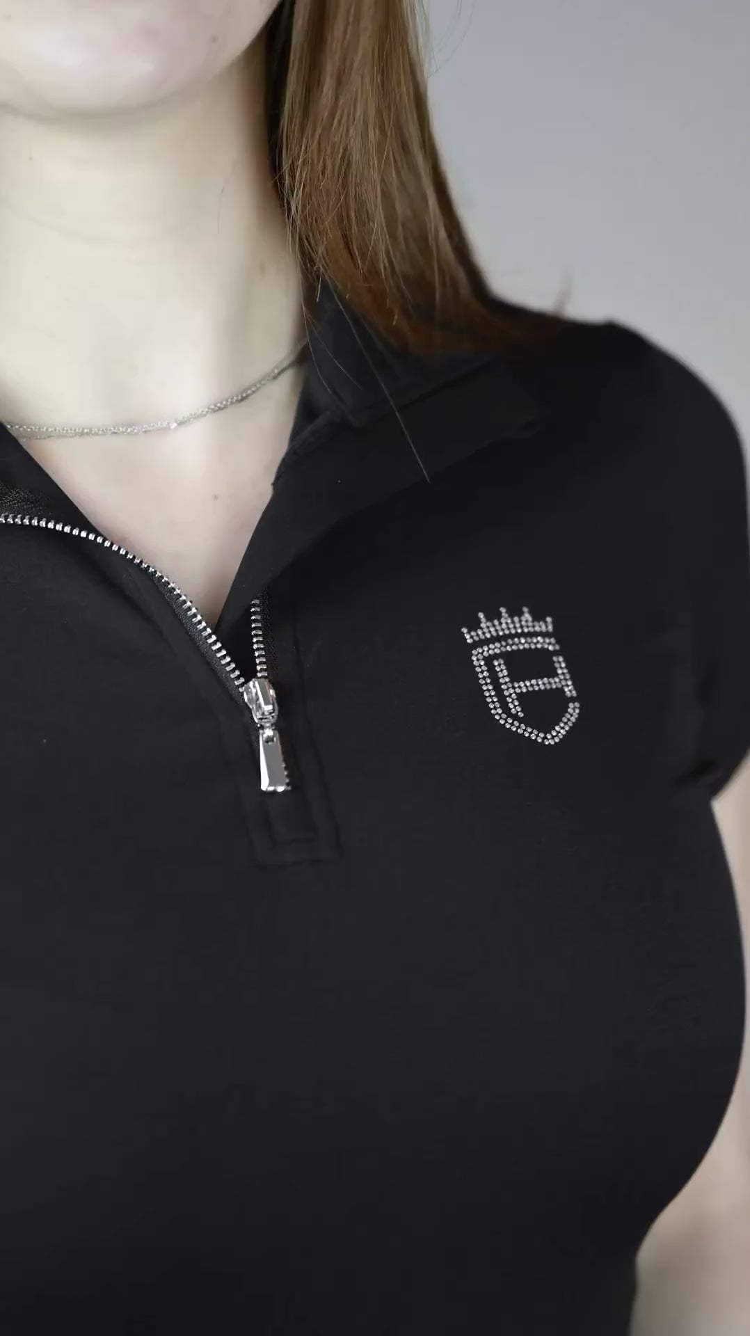 Das schwarze Funktions-T-Shirt überzeugt mit atmungsaktivem Material für ein angenehmes Tragegefühl bei jeder Aktivität. Der sportliche V-Ausschnitt mit edlem Halfzip-Reißverschluss bietet flexible Belüftung und verleiht dem Design einen modernen Touch. Die elastische Passform bietet maximale Bewegungsfreiheit und schmiegt sich angenehm an den Körper an. Unser dezentes Logo mit funkelnden Strasssteinen auf der Brust rundet den Look stilvoll ab.