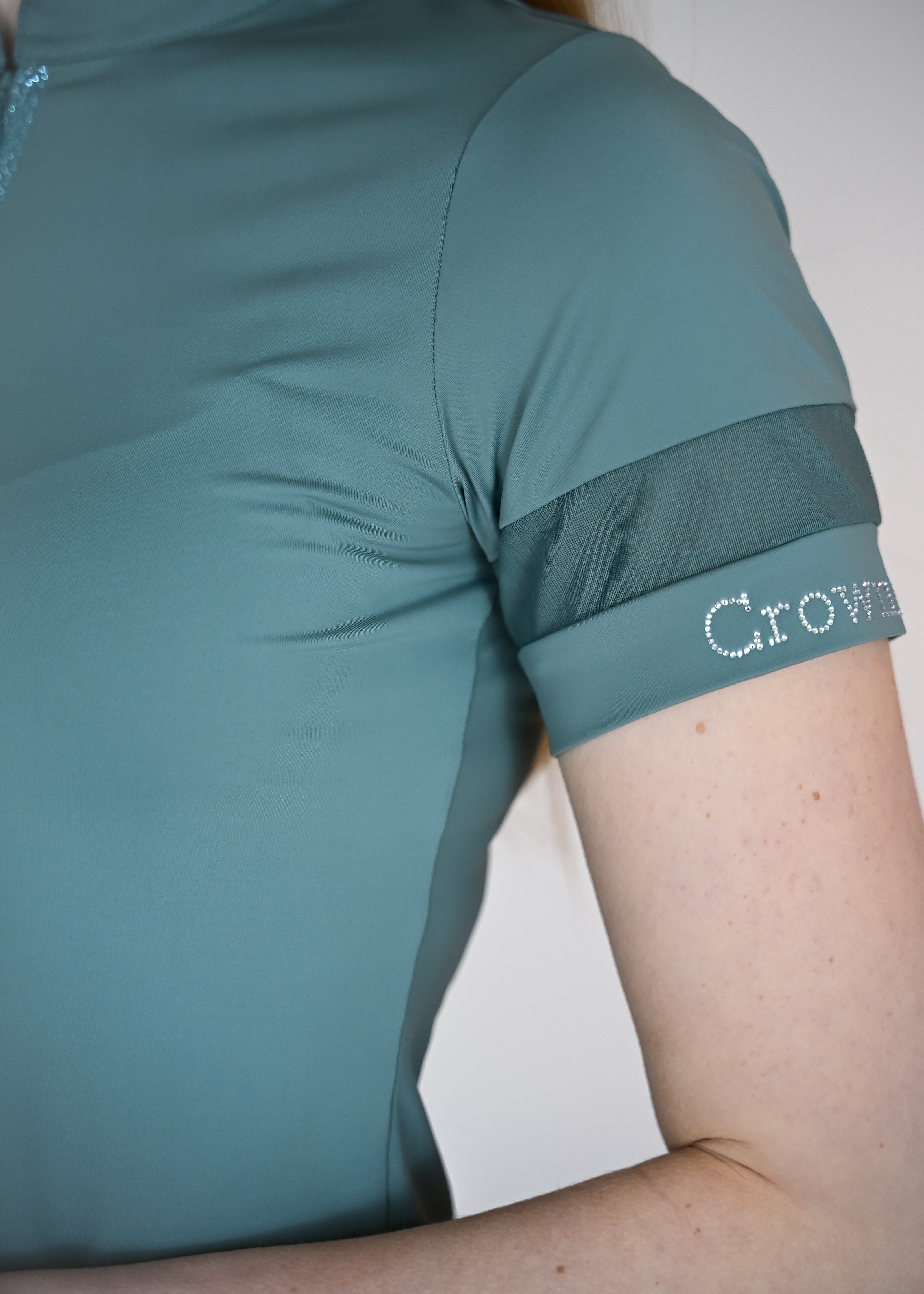 Dieses elegante Funktionsshirt vereint Stil und Tragekomfort auf höchstem Niveau. Der hohe Kragen mit dezentem Glitzerreißverschluss verleiht dem Shirt einen edlen Touch, während feine Strassdetails entlang der Vorderseite stilvolle Akzente setzen. Der atmungsaktive Stoff sorgt für ein angenehm leichtes Tragegefühl, während transparente Mesh-Einsätze an den Ärmeln eine moderne Note und optimale Luftzirkulation bieten. Ein besonderes Highlight ist der mit Strasssteinen verzierte CrownHorse-Schriftzug an den Ärmeln. Die körpernahe Passform liegt bequem am Körper an und rundet das Design perfekt ab.